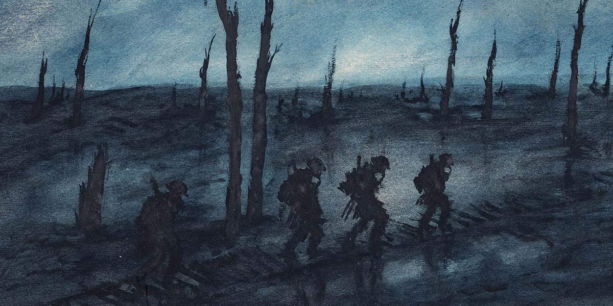 FJ Mears, World War I battlefield at nightInk and watercolour, c. 1913. Wikimedia Commons.