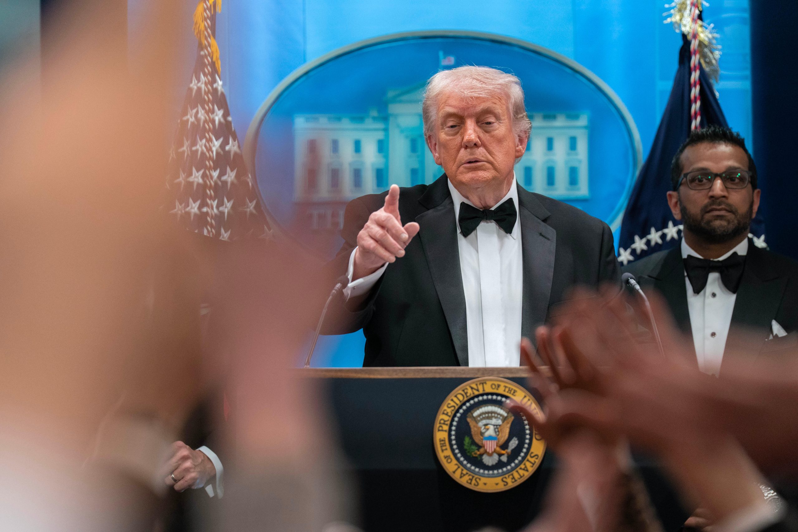 President Donald Trump, standing at the White House briefing room podium in his tuxedo after the shooting at the White House correspondents’ dinner Saturday night, called for calm.
